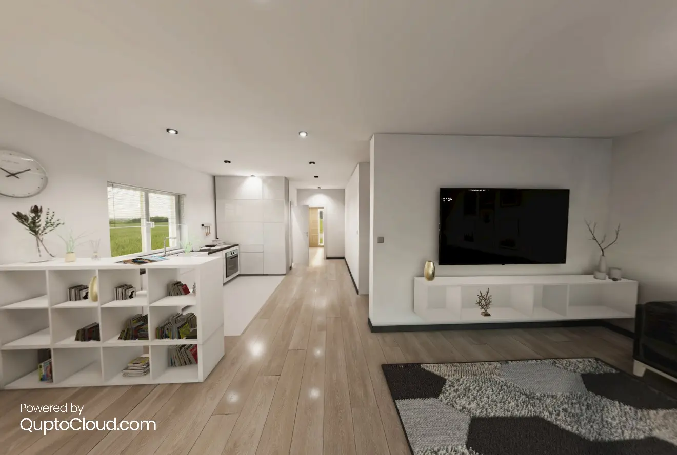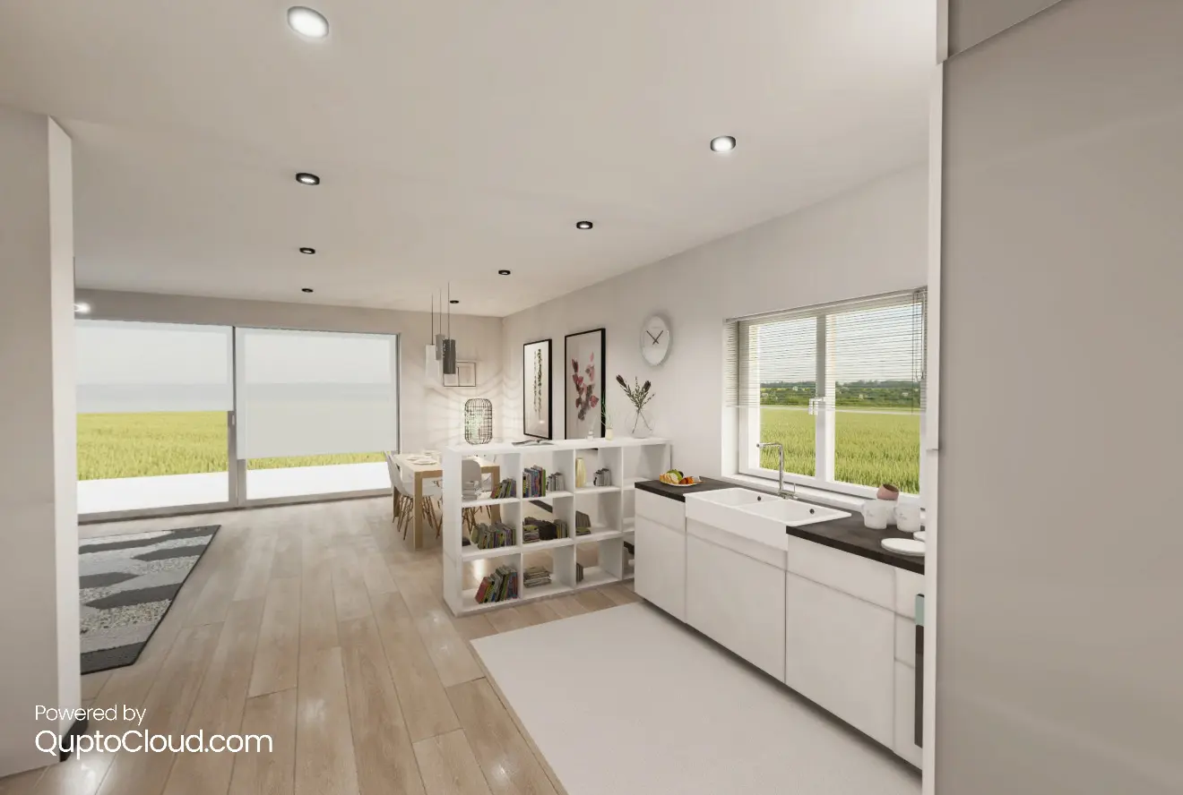 Das Erdgeschoss ist in erster Linie der Wohnbereich - ein offenes, geräumiges Wohnzimmer mit Essbereich und Küchenzeile, WC, Heizungsraum und Garage.