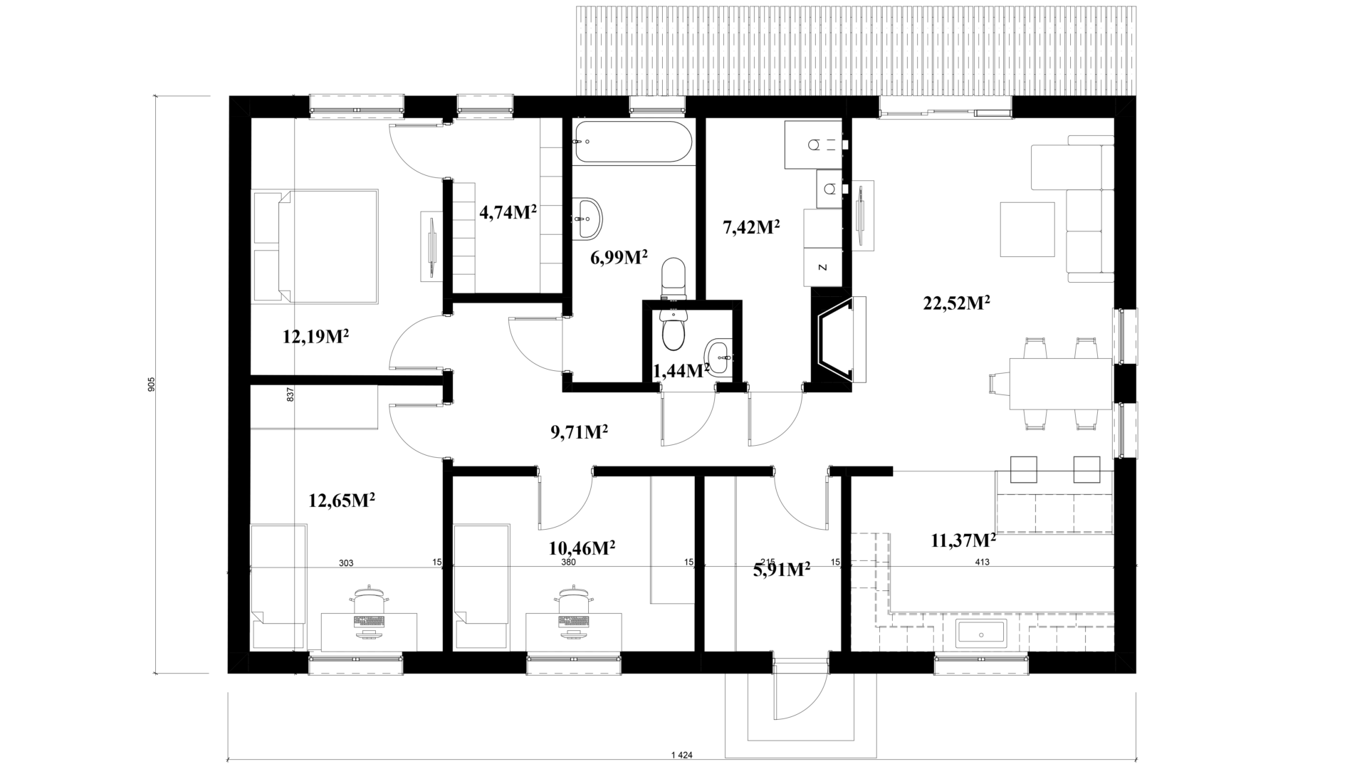 Dom „Hanover” w wersji parterowej to klasyczna bryła z nowoczesnym akcentem, której wyjątkowy charakter podkreśla elewacja z deski elewacyjne Ciepłe, naturalne materiały nadają mu przytulnego wyglądu, a weranda z przodu budynku tworzy idealne miejsce do relaksu i spotkań na świeżym powietrzu.