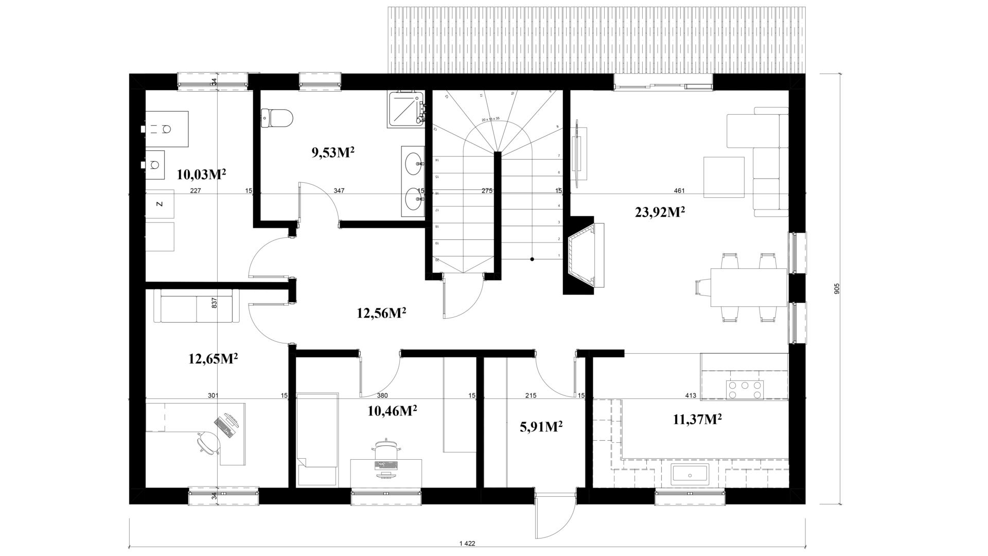 Przestronny parter obejmuje otwartą część dzienną z salonem, jadalnią i kuchnią, a piętro oferuje komfortową strefę prywatną z sypialniami. Duże okna zapewniają doskonałe doświetlenie wnętrz, podkreślając ciepłą i przyjazną atmosferę domu.